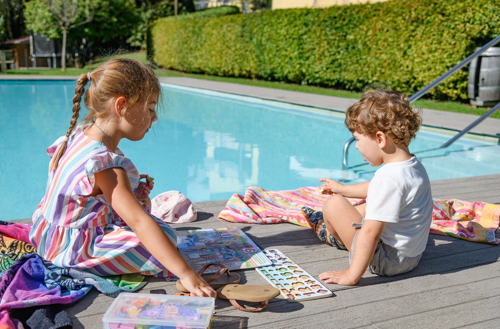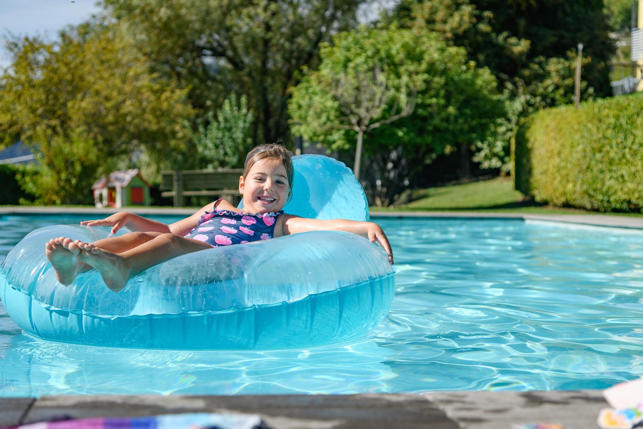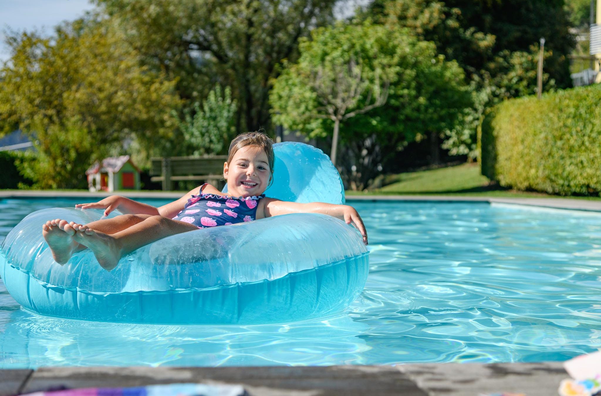 Unsere Liegewiese rund um das Schwimmbad ist mit Liegestühlen und Sonnenschirmen ausgestattet und eignet sich sowohl für gemeinsame Spiele als auch für entspannte Lesestunden.